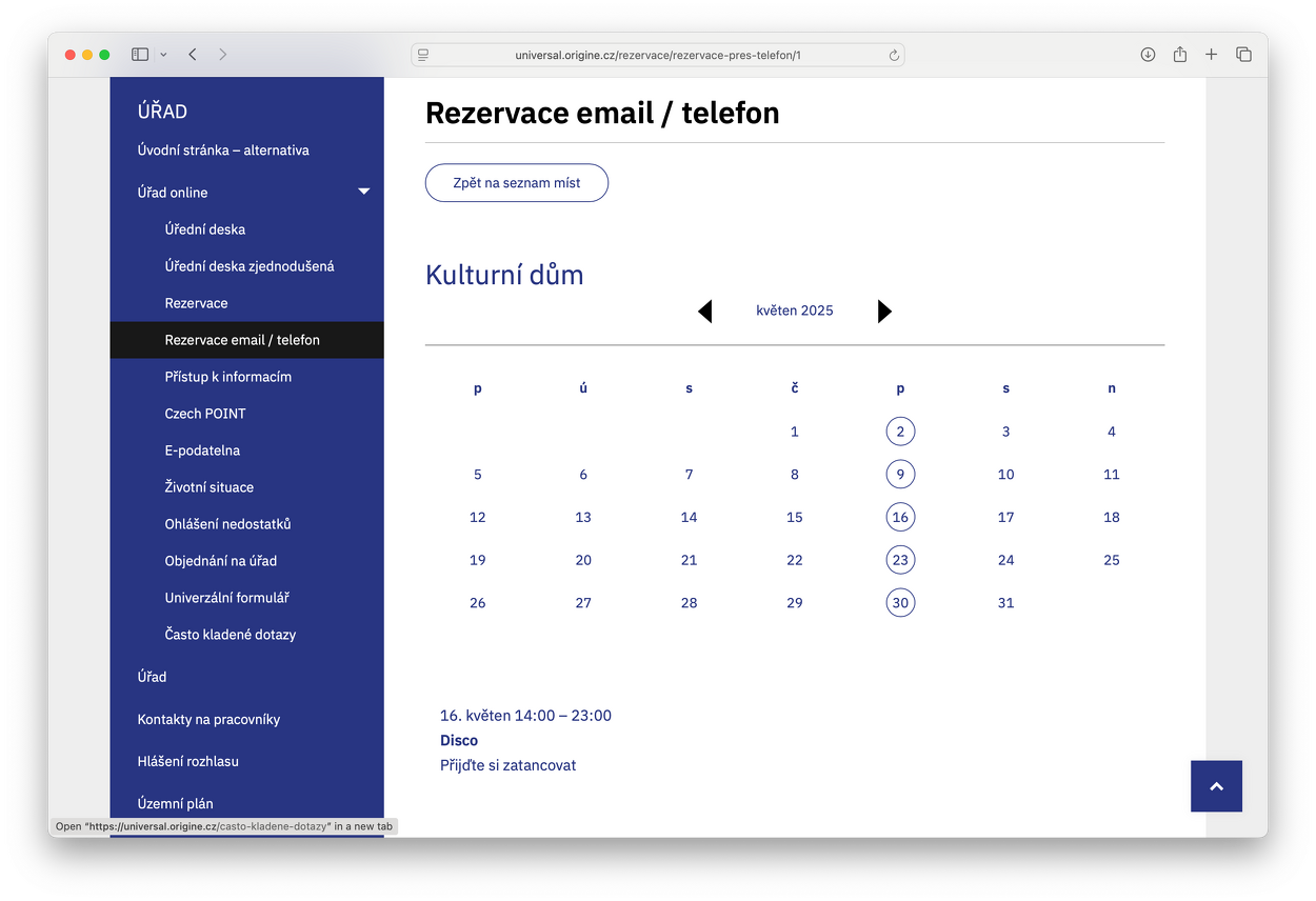 - Rezervace přes telefon/e-mail – zobrazí zarezervované dny a časy v kalendáři. Administrátor přijímá rezervace a ručně je zapisuje do kalendáře.