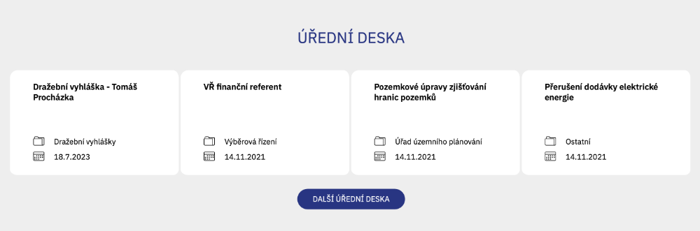 Zobrazení na úvodní stránce se upraví v menu klikem na Bloky > Úvodní stránka > položka ÚŘEDNÍ DESKA typu Generování z položek. Lze nastavit počet položek např. 1–4 nebo 1–8. Doporučujeme násobky 4, pro hezké zobrazení na desktopech.