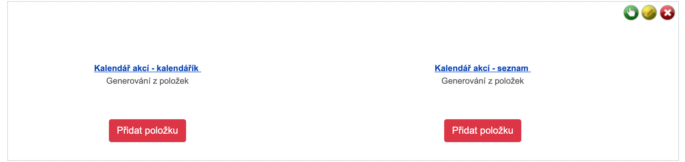Kalendář akcí (4) se generuje a nastavuje podobně jako Aktuality, jen zvlášť pro kalednářík a zvlášť pro seznam. Pozadí sekce lze změnit přejetím přes tuto sekci a objeví se pomocné menu vpravo nahoře s ikonkou editace vlastností sekce